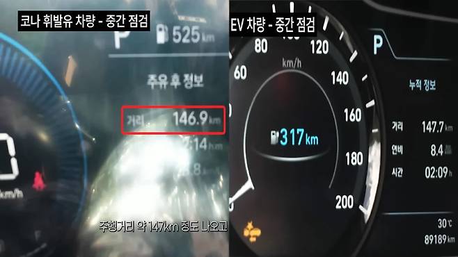 약 295km를 동일 조건에서 주행한 결과, 코나 가솔린은 총 16.6리터의 연료를 소모해 27,056원이 들었고, 전기차는 38.48kWh를 충전해 12,480원이 나왔다.