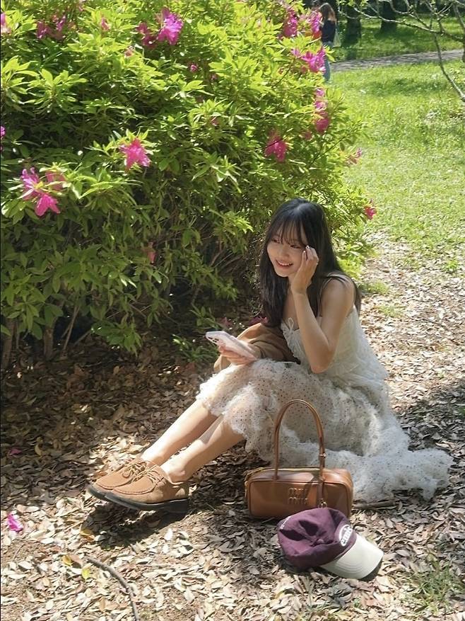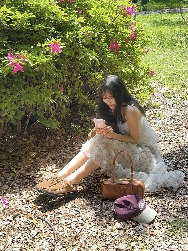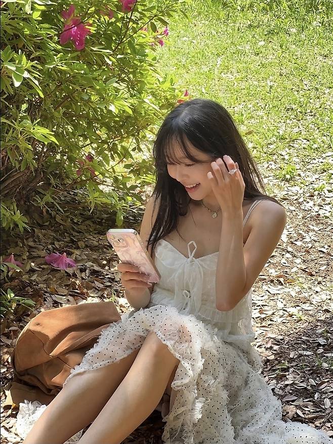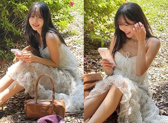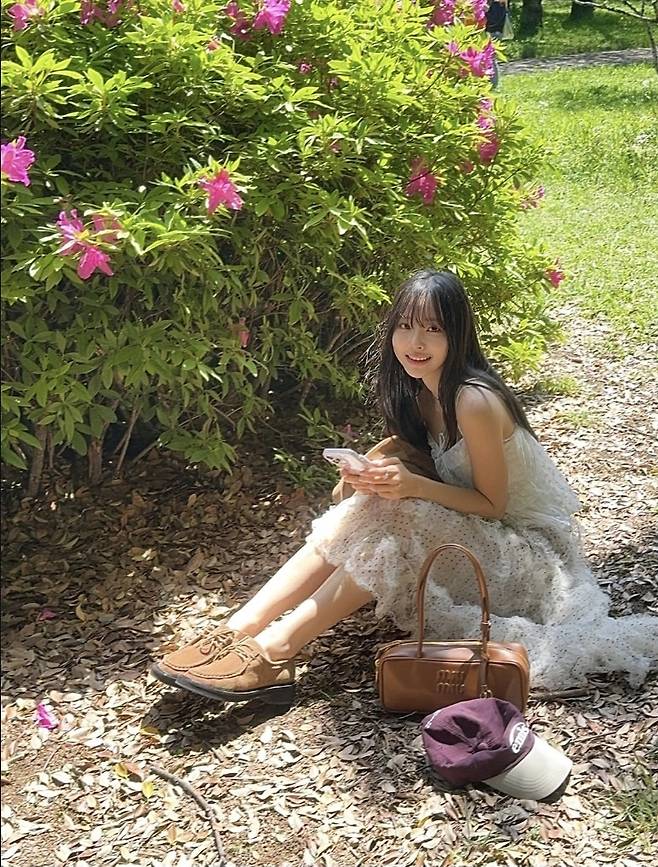 따스한 초여름 햇살 아래, 화사한 플라워 정원에 앉아 여유를 만끽한 이솔이는 러플 디테일이 돋보이는 뷔스티에 스타일의 화이트 쉬폰 원피스를 입고 등장해 동화 속 주인공 같은 분위기를 자아냈습니다.