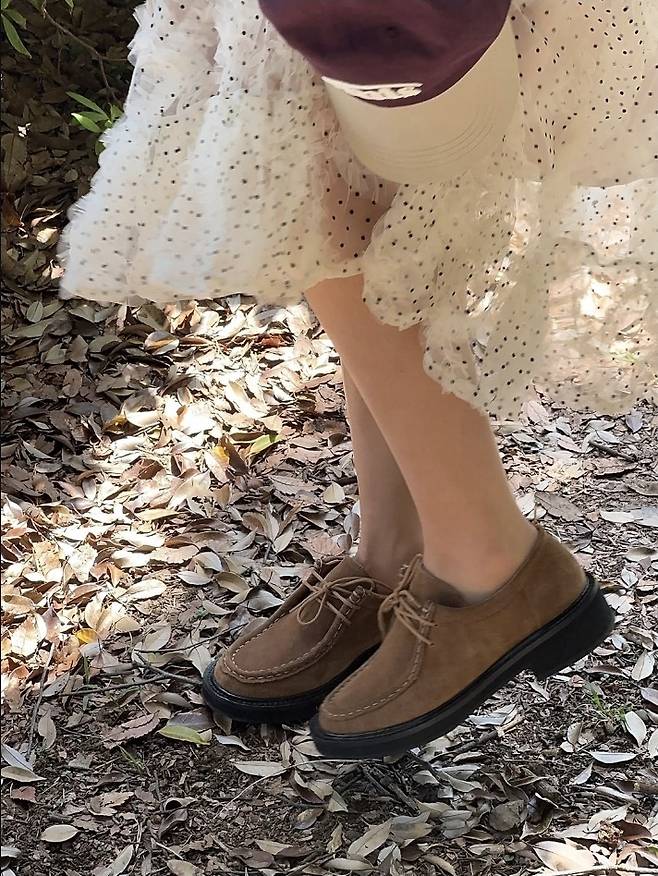 풍성한 셔링과 도트 패턴이 사랑스러운 이 원피스는 발랄하면서도 로맨틱한 감성을 더했고, 빈티지한 브라운 로퍼와 미우미우 레더 백, 버건디 볼캡을 곁들여 내추럴한 무드로 완성했습니다.