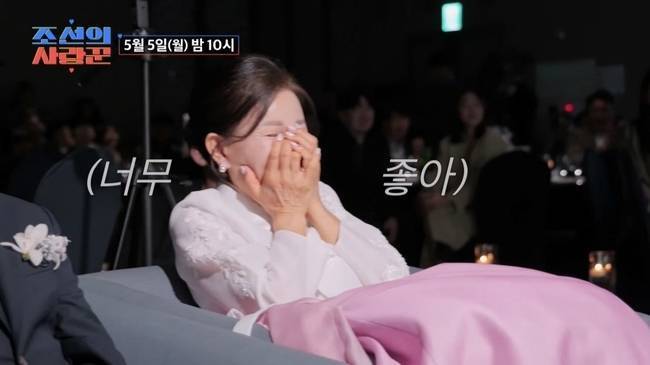 영상이 끝나자 얼굴이 새빨개진 강은비 어머니는 사위를 향해 큰 하트를 날려 보답했습니다. 이에 변준필도 장모님에게 보답의 하트를 날렸고, VCR을 지켜본 MC들은 “진짜 좋아하신다”라며 훈훈한 광경에 미소를 지었습니다.