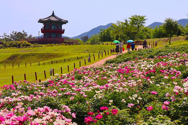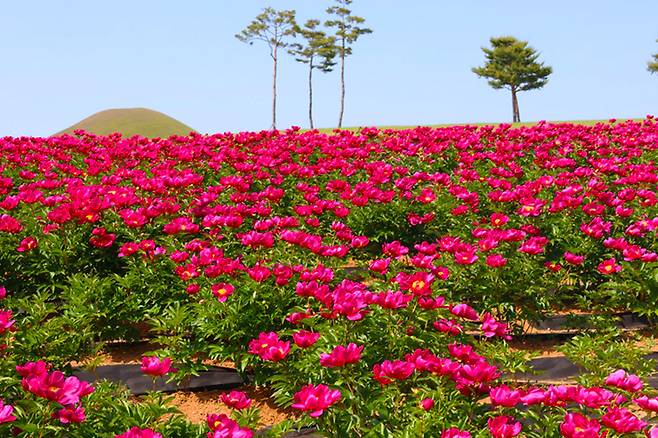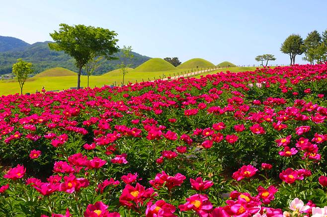 진한 붉은색을 띤 작약이 고분군을 배경으로 만개해, 유서 깊은 묘와 생명의 꽃이 한 프레임에 담기는 장면은 사진으로 남기기에 더없이 좋다.