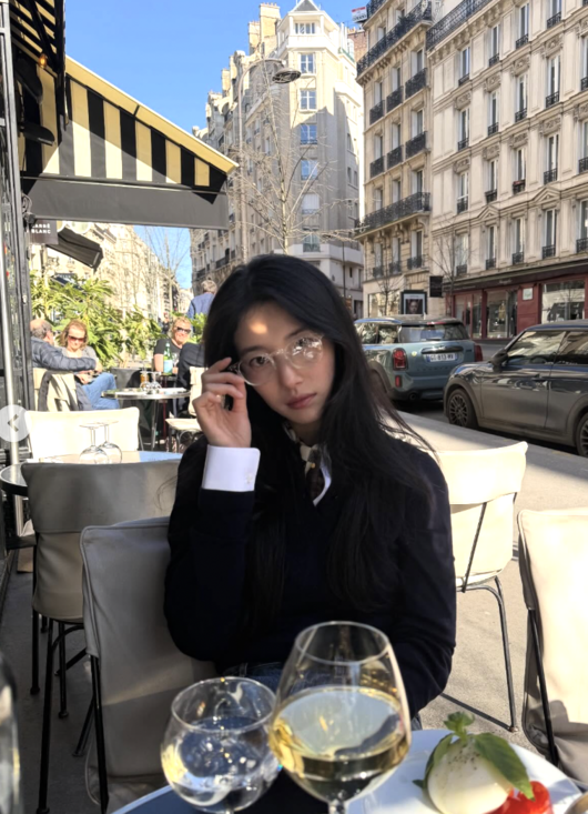 블랙 의상에 안경을 더한 단정한 스타일링과 함께 차분한 분위기를 자아냈다. 테이블 위에 놓인 와인과 디저트, 햇살이 비추는 파리 거리 풍경이 어우러지며 영화 같은 장면을 연출했다.
