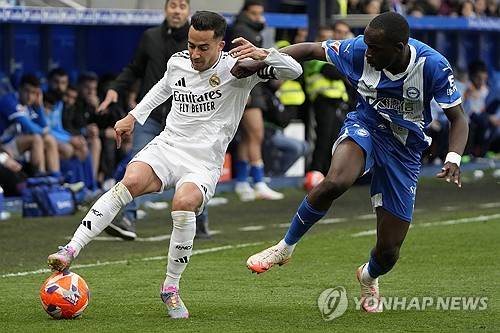 epa12030046 Real Madrid's Lucas Vazquez (L) in action against Alaves' Moussa Diarra (R) during the Spanish LaLiga soccer match between Deportivo Alaves and Real Madrid, in Vitoria, Spain, 13 April 2025. EPA/ADRIAN RUIZ HIERRO