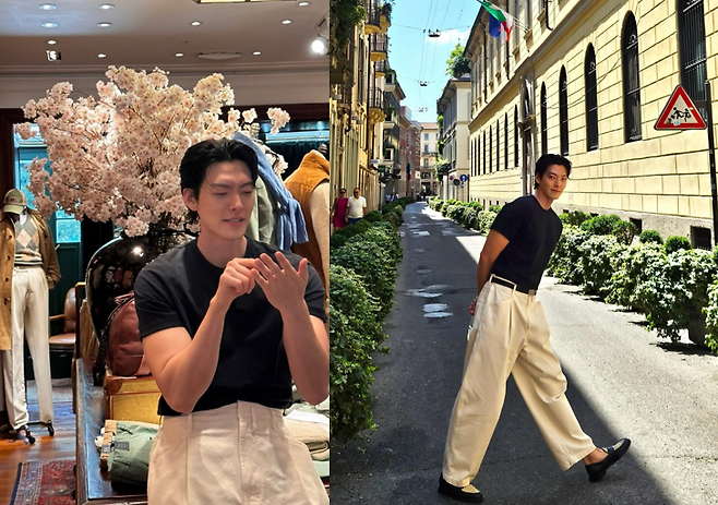 배우 김우빈이 유럽의 햇살 아래서도 독보적인 아우라를 뽐내며, 김우빈은 내추럴한 블랙 반팔 티셔츠와 아이보리 컬러 와이드 팬츠로 심플하지만 트렌디한 남친룩을 완성했다.