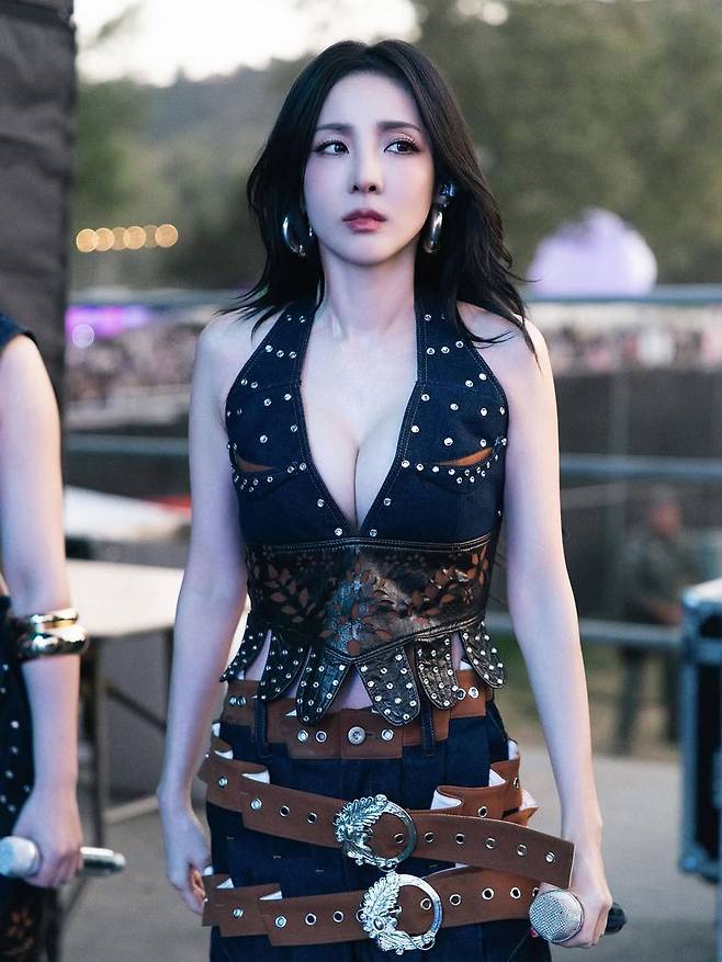 산다라박이 최근 인스타그램에 공개한 무대 백스테이지 컷이 뜨거운 반응을 얻고 있다. ‘2NE1’ 로고와 함께한 이번 사진은 LA 'Head In The Clouds' 페스티벌 현장에서 촬영된 것으로 보이며, 과감한 Y2K 무드의 패션으로 시선을 사로잡는다. 데님과 가죽, 스터드, 벨트 등의 요소를 믹스매치한 스타일링은 산다라박 특유의 당당하고 개성 넘치는 분위기를 더욱 강조한다.