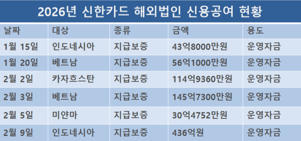 10일 금융권에 따르면 신한카드는 올해 들어 해외법인에 총 6차례의 신용공여를 진행했다. 규모별로는 인도네시아가 479억8000만원으로 가장 많았고 △베트남 201억8000만원 △카자흐스탄 114억9360만원 △미얀마 30억4752억원으로 집계됐다.