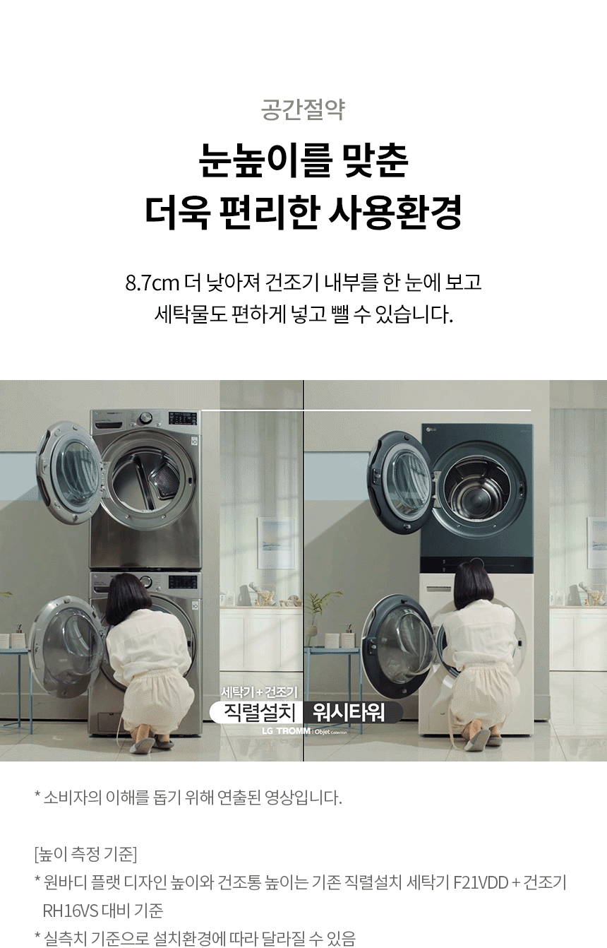 용량이 다른 세탁기와 건조기를 따로 구매해 직렬로 배치할 경우, 사이즈가 서로 달라 깔끔하지 않고 어색해 보이기도 하다. 가로 폭이 동일한 세트 제품이라 할지라도 접합부의 틈과 굴곡이 주는 투박한 느낌은 사라지지 않는다.