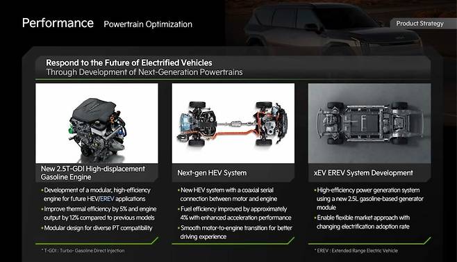 하이브리드 시스템은 현대 팰리세이드 하이브리드와 동일한 구성을 채택할 것으로 예상된다. 2.5리터 터보 가솔린 엔진은 6단 자동변속기와 결합해 262마력(258hp)의 출력과 36kgf·m(260lb.-ft.)의 토크를 발휘한다. 여기에 54kW(72마력) 출력의 전기 모터가 264Nm(195lb.-ft.)의 토크를 더해 시스템 총출력은 334마력(329hp)에 이를 전망이다.