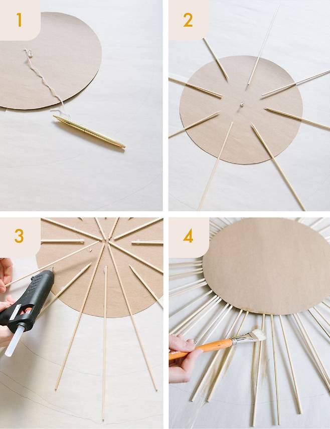 어묵꼬지를 크기별로 잘라 종이에 방사형으로 붙이면 기본 골격이 완성된다. 중심은 거울 크기에 맞춰 종이나 박스를 자른 뒤 고정한다. 어묵꼬지를 대칭적으로 붙이기 위해 피자 자르듯 선을 그어 배치하면 깔끔하게 완성된다. 마무리 줄까지 달면 끝.