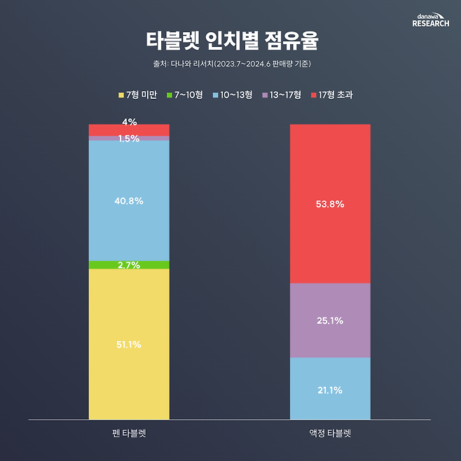 다나와 리서치에 따르면 형태별로 주로 판매된 크기가 확연하게 다른 것으로 나타났다. 펜 타블렛은 7형 미만(51.1%) 및 10~13형(40.8%)가 높은 점유율을 보였고, 액정 타블렛은 17형 이상 제품(53.8%)이 강세를 보였다.