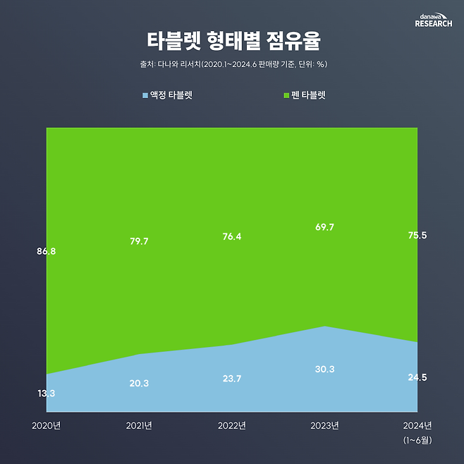하지만 현재는 이전보다 진입 장벽이 많이 낮아졌다. 휴이온, 한본 등 가성비를 내세운 중국 브랜드드의 등장으로 액정 타블렛의 가성비가 점점 좋아지는 추세다. 다나와 리서치에서도 액정 타블렛의 점유율이 이전보다 많이 늘어난 것을 확인할 수 있다.