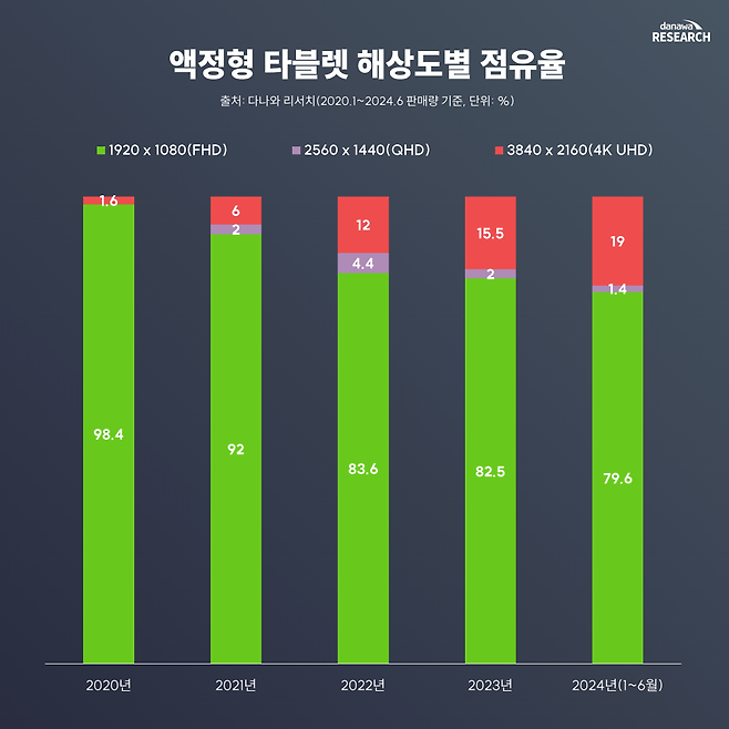다나와 리서치에 따르면 액정 타블렛은 점점 고해상도 제품이 대세가 되고 있다. 올해 상반기 판매된 제품의 19%가 4K UHD이었고, 그 비중은 꾸준히 늘어나는 중이다. 기술의 발전 및 중국 브랜드의 가세로 인해 고해상도지만 비교적 가격이 저렴한 제품들이 많이 등장하면서, 가격대가 이전보다 많이 저렴해진 것이 주요 원인으로 보인다. 예컨대 4K UHD 액정 타블렛 중 가장 인기가 많은 WACOM Cintiq Pro 16 리뉴얼의 경우 가격대가 1,869,000원이지만, HUION KAMVAS Pro 16 PLUS은 730,000원에 불과하다.
