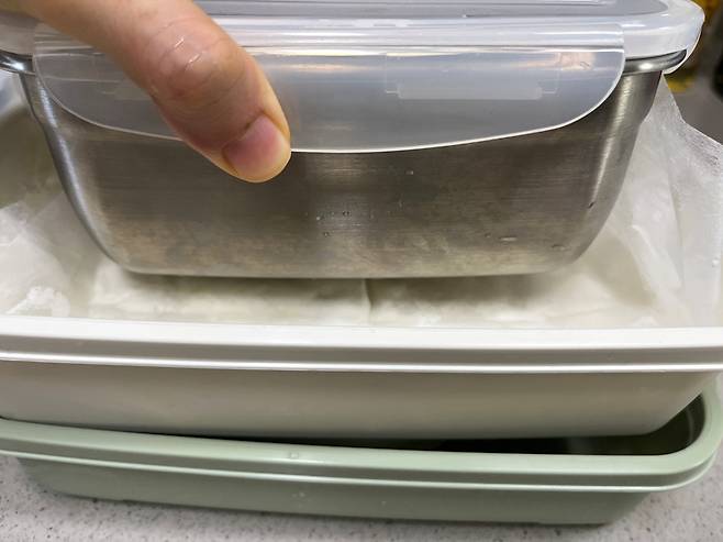 꾸덕한 질감의 그릭요거트를 원하신다면 이렇게 2차까지 유청 분리를 해줘야 합니다. 2차에 할 때는 밀폐 용기에 물을 채워 요거트 위에 올려 놓습니다. 무거운 것을 올려 놓아야 유청 분리가 더 잘 됩니다.