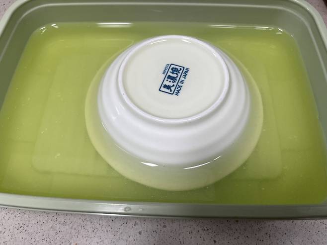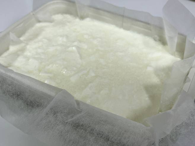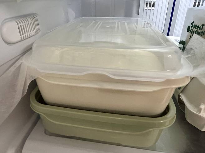뚜껑을 잘 덮은 후 냉장고에 약 12시간 보관하여 1차로 유청을 분리합니다.