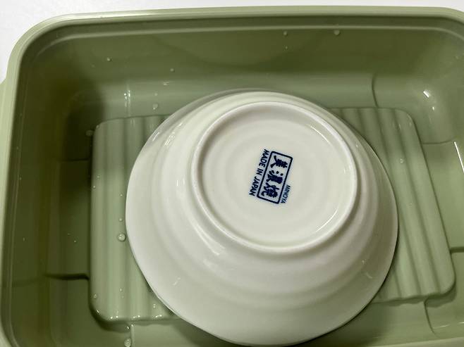 채반 용기 바닥에 작은 접시를 올려놓습니다. 아래쪽으로 유청이 떨어질 공간을 만들기 위해 채반과 용기 바닥 사이를 띄워놓는 것입니다.