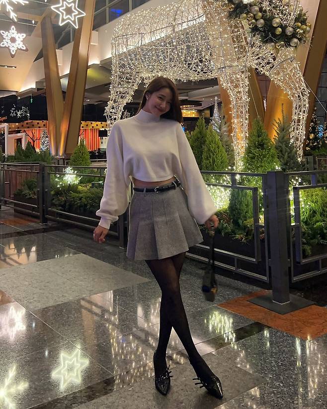 두 번째 사진에서는 포멀한 분위기의 미니스커트 룩을 선보였다. 하얀 크롭 스웨터와 그레이 컬러의 플리츠 스커트를 매치해 여성스러운 매력을 강조했다. 특히, 블랙 스타킹과 로퍼 힐을 더해 우아하면서도 시크한 느낌을 완성했다. 이 룩은 특별한 자리나 저녁 모임에 어울리는 세련된 선택이다.
