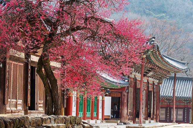 지리산 자락에 자리한 화엄사는 천년이 넘는 역사를 간직한 사찰로, 특히 봄이 되면 천연기념물로 지정된 홍매화가 만개하며 장관을 이룹니다. 해마다 이 시기가 되면 붉은 빛을 머금은 매화가 피어나 사찰의 고즈넉한 분위기와 어우러져 독특한 정취를 선사합니다.