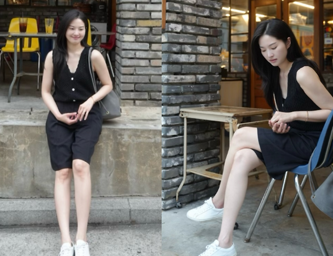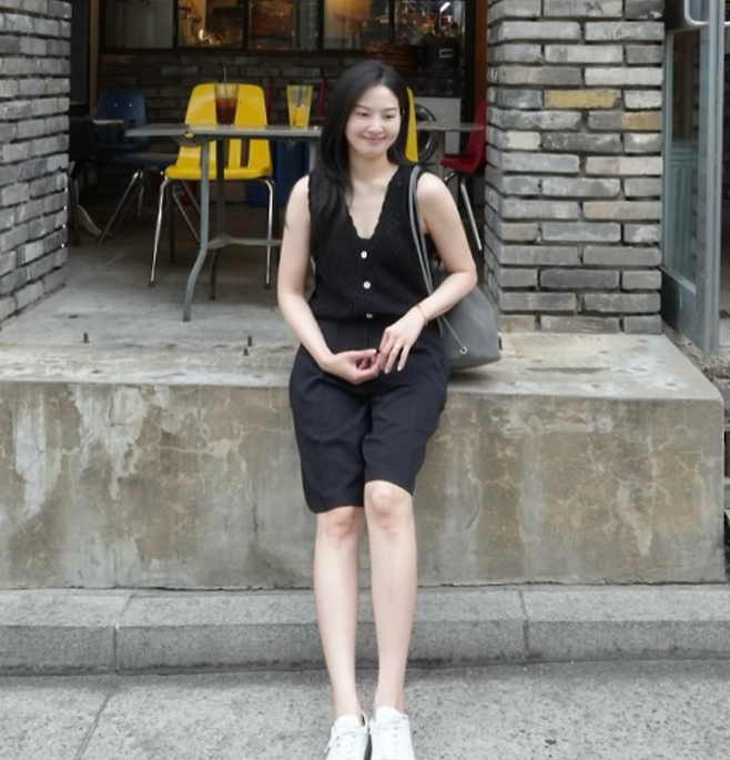 전진 신화 와이프인 류이서 님은 블랙 베스트와 블랙 버뮤다 팬츠를 매치하여 심플하면서도 세련된 스타일을 완성했습니다.
