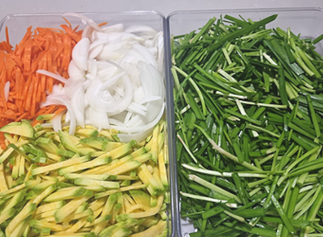 부추를 4~5cm 길이로 썰고, 다른 채소들도 얇게 채 썰어주세요.💡 한 번에 많이 썰어서 밀폐용기에 보관하면 다음 부침 때 편리해요!