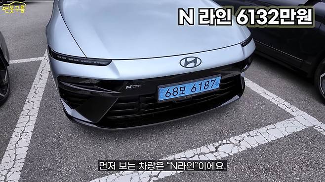새로운 차량이니 디자인부터 한번 살펴보겠습니다. 먼저 눈에 띄는 차량은 "N라인"인데요, 전면부에서 가장 먼저 다른 점은 엠블럼 색상입니다. N라인은 고성능을 연상시키는 블랙 색상의 엠블럼을 사용하고 있고요, 일반 모델과는 다른 세로 패턴의 얼굴을 가지고 있습니다. 물론 이렇게 N라인 배지도 부여받았죠.