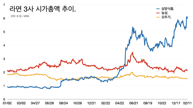- 지난해 1월 삼양식품 주식 1주를 23만 원에 샀다면 올해 2월 81만 원이 됐을 것이다.