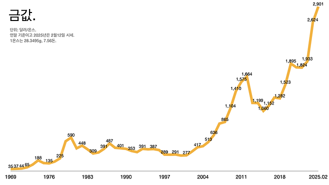 - 안전자산 선호 현상으로 금 거래가 폭증하고 있다. 국제 금 선물 가격이 1온스에 2900달러를 넘어섰다. 1년 동안 80% 이상 올랐다.