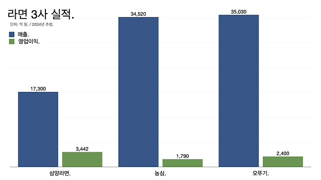 - 매출액은 라면 3사 가운데 삼양식품이 절반 수준이다. 농심과 오뚜기가 각각 3.4조 원과 3.5조 원인데 삼양라면은 1.7조 원이다. 영업이익은 거꾸로 삼양라면이 두 배 정도 된다.