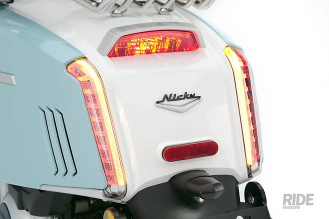 이 차의 또 다른 특징은 후미부다. 기존 클래식 스쿠터들은 물방울 모양을 눕힌, 시트쪽은 동그랗고 후미로 갈수록 날씬해지는 형태의 디자인을 사용하는데, 니키는 차량 끝부분을 마치 칼로 싹둑 도려낸 듯한 모습이다. 그렇게 잘린 단면 중앙에는 브레이크등을, 좌우 양끝으로 방향지시등을 배치해 디자인을 차별화한 점이 꽤나 인상적이다. 전반적으로 1950년대 개성 있는 디자인의 미국차를 보는 듯한 느낌이 들 만큼 니키의 디자인은 독특한 맛이 있다.
