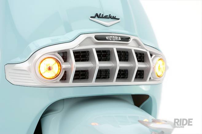 대부분 스쿠터들이 전면 카울에는 데칼을 입히거나 브랜드 로고 정도를 부착하는 선에서 마무리하는데, 니키는 마치 자동차의 그릴을 연상시키는 파격적인 디자인을 채용했다. 헤드라이트처럼 보이는 좌우의 램프는 바로 방향지시등. 브랜드 엠블럼은 펜더 위에 간략화되어 자리했는데, 꽤 오래된 느낌이 물씬 풍기는 엠블럼을 그대로 담지 않아 다행이라는 생각이다.