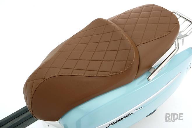 시트는 앞뒤 분리형을 채택하고 탠덤 시트를 더해 운전자와 동승자 모두 편하게 탈 수 있게 구성했다. 시트 포면은 턱 앤 롤이나 격자 바느질 느낌이 나도록 표면 처리를 더해 디자인적인 효과와 함께 엉덩이가 미끄러지는 것을 방지했다. 운전석 시트 하단에는 수납공간이 있어 헬멧 등을 보관할 수 있으며 핸들 하단 왼쪽에도 USB 충전 포트를 내장한 글러브 박스를 더해놓았다. 플로어 패널은 완전히 평평하진 않으나 중앙 돔의 높이가 크지 않아 장바구니나 작은 박스 등도 문제없이 실을 수 있는 구성. 작은 봉투 등을 걸 수 있는 고리가 내장되어 있어 편리하게 활용할 수 있다. 시트 뒤쪽으로 캐리어가 마련되어 작은 화물 적재도 가능하고, 옵션으로 발매되는 가죽 가방을 장착해 드레스업 효과도 기대할 수 있다.