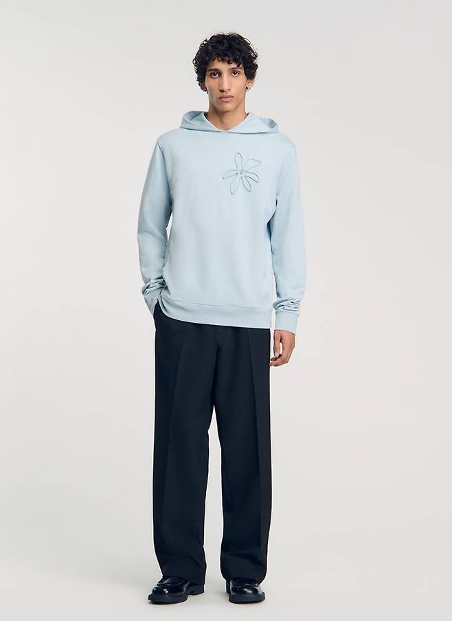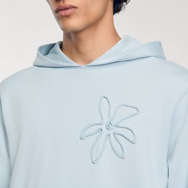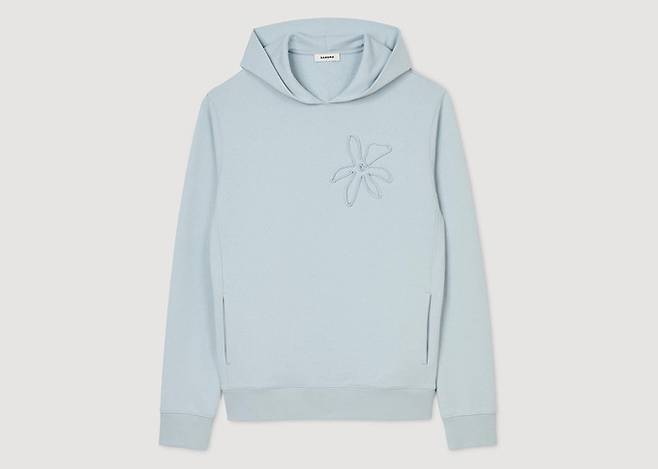 프렌치 컨템포러리 '산드로옴므' 톤온톤 플라워 자수 장식 후드 티셔츠 관심 폭발