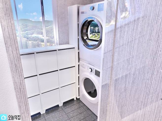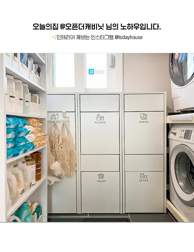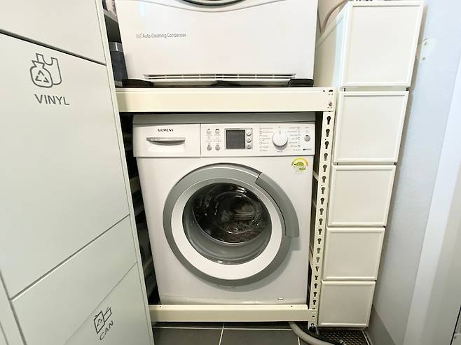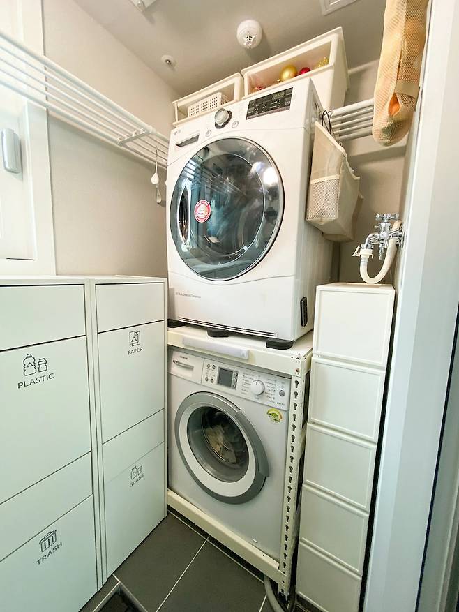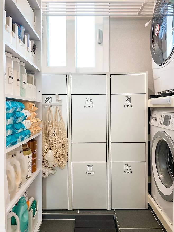 분리수거함까지 넣어줬을 때 세탁실 모습이에요. 정말 빈틈없이 채워 넣었죠?