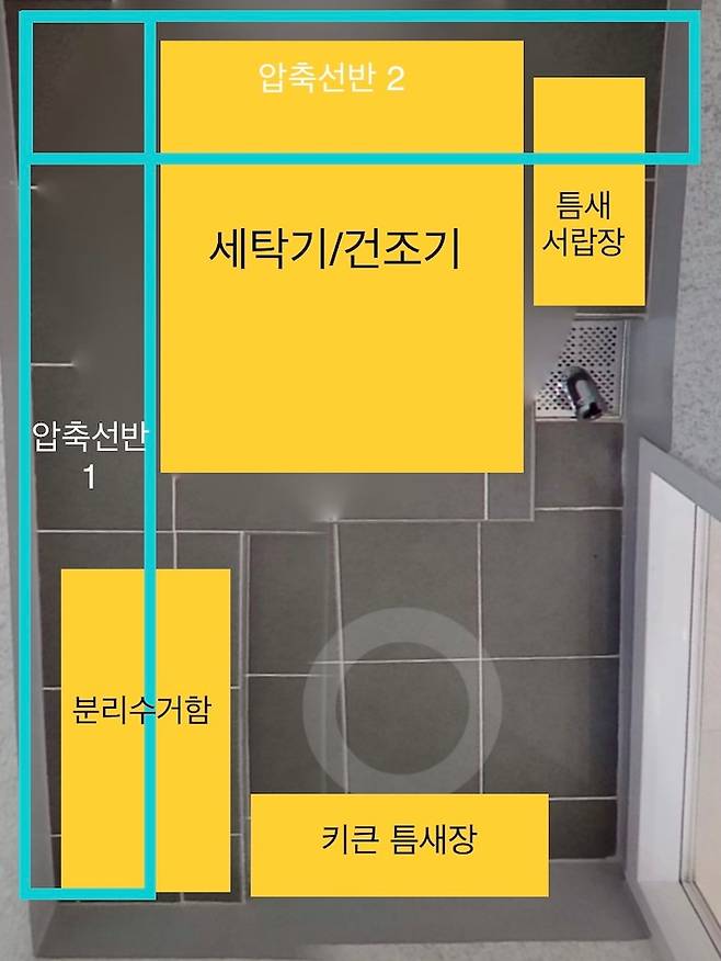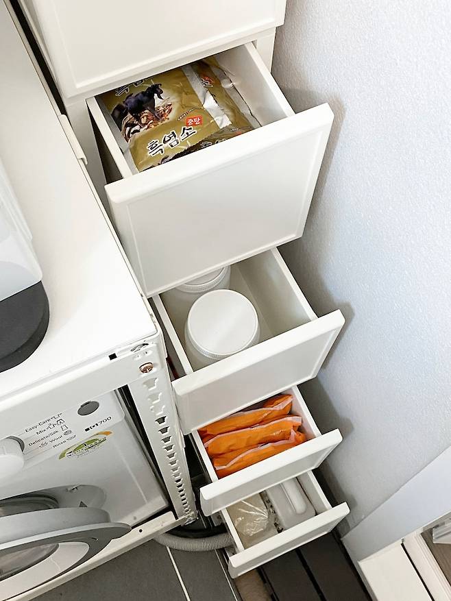 저희 집 세탁실 구조상 세탁기가 정 가운데에 위치할 수밖에 없었어요. 덕분에 세탁기 양옆으로 약 20cm 정도 공간만 허락됐죠.