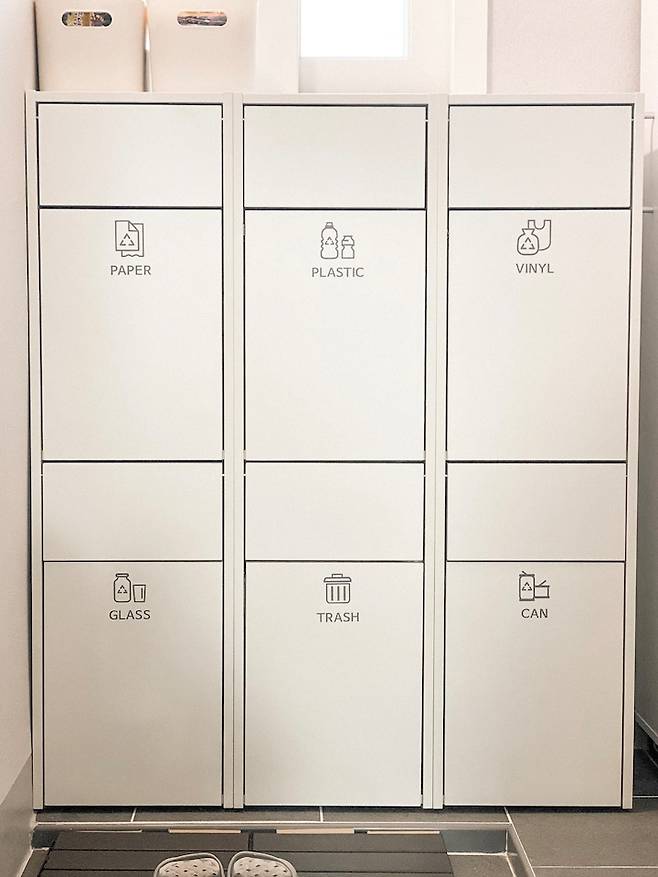 총 6종류의 분리수거가 가능하고 용량이 무려 70리터나 된답니다. 일주일에 한번 분리수거를 하는 저희 맞벌이 부부에게 아주 넉넉하고 워낙 튼튼해서 수납선반으로 사용할 수도 있어요.