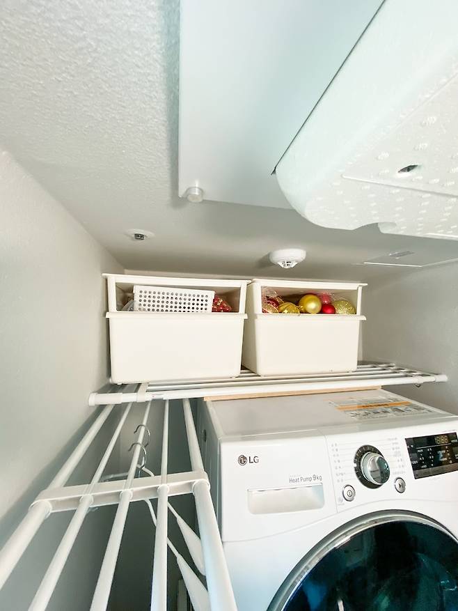 왼쪽의 남는 20cm 공간에는 압축 선반을 설치했어요. 건조기가 있더라도 자연건조를 해야 하는 옷들도 있기 때문에 이 공간을 건조대로 활용하기로 했어요.
