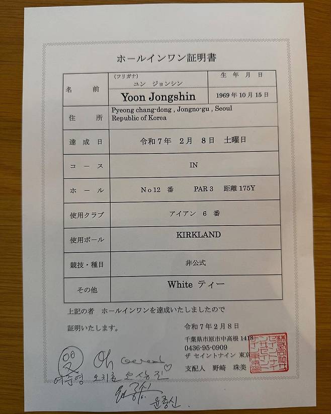 윤종신이 기록한 홀인원은 12번 홀, 175야드에서 6번 아이언으로 만들어낸 결과였다. 골프를 즐기는 이들에게는 평생 한 번 경험하기도 어려운 행운의 순간으로, 그의 기쁨이 사진 속에서도 고스란히 전해진다.