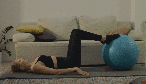 매트에 누워 짐볼 위에 발을 올립니다. 양손은 바닥에 두고, 균형을 잡습니다. 엉덩이를 들어 올려 브릿지 자세를 만듭니다. 균형을 유지하며 엉덩이를 내렸다가 다시 올립니다.
