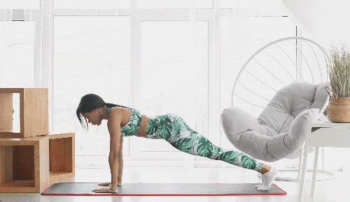 플랭크 기본자세로 매트에 엎드립니다. 팔꿈치는 완전히 편 상태를 유지하고, 시선은 바닥을 응시합니다. 오른발을 공중으로 들었다가 내립니다. 왼발을 공중으로 들었다가 내립니다.