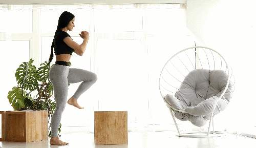 스텝박스 또는 오를 수 있는 도구 앞에 서서 시작합니다. 왼쪽 다리를 도구 위에 올립니다. 오른쪽 다리를 뒤로 뻗으세요. 이번에는 오른쪽 다리를 도구 위에 올리고, 왼쪽 다리를 뒤로 뻗습니다.