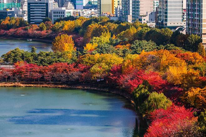 서울 잠실의 석촌호수를 에워싼 산책로는 노랗고 붉은 단풍나무들이 줄지어있습니다. 호수 한가운데에는 롯데월드가 있어 마치 동화 속으로 빠진 듯한 느낌도 선사하는데요. 석촌호수 한 켠에서는 서울의 랜드마크, 롯데타워가 보이기도 하는 등 다양한 시점으로 단풍놀이를 즐기기 좋은 장소입니다.