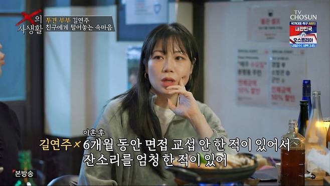 31일 방송된 TV CHOSUN 'X의 사생활'에서는 '투견부부'로 알려진 길연주가 전 남편 진현근과 이혼한 뒤의 일상과 심경을 공개했다. 그는 아이를 중심으로 한 삶과 관계에 대한 고민을 조심스럽게 꺼냈다.