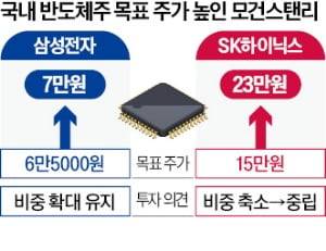 모건스탠리는 지난 18일 ‘D램-침체를 넘어 미래를 보다’(DRAM-Looking beyond the valley)라는 보고서를 내고 삼성전자 목표주가를 6만5000원에서 7만원으로, SK하이닉스는 15만원에서 23만원으로 올렸다. 삼성전자 투자의견은 ‘비중 확대’를 유지했고 SK하이닉스는 ‘비중 축소’에서 ‘중립’으로 상향했다.