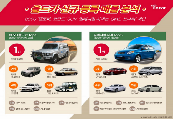 자동차 거래 플랫폼 엔카닷컴에 따르면, 1980~1999년식, 2000~2010년식으로 구분해 1월부터 7월 기간까지 신규 등록된 Top10 모델의 빅데이터 분석 결과, 8099연식은 정통 SUV, 2000년대 초 밀레니얼 시기는 세단과 경차 중심으로 중고차 거래가 이뤄졌으며, 이 중 인기가 높은 올드카는 현대 갤로퍼, 기아 뉴모닝으로 나타났다.