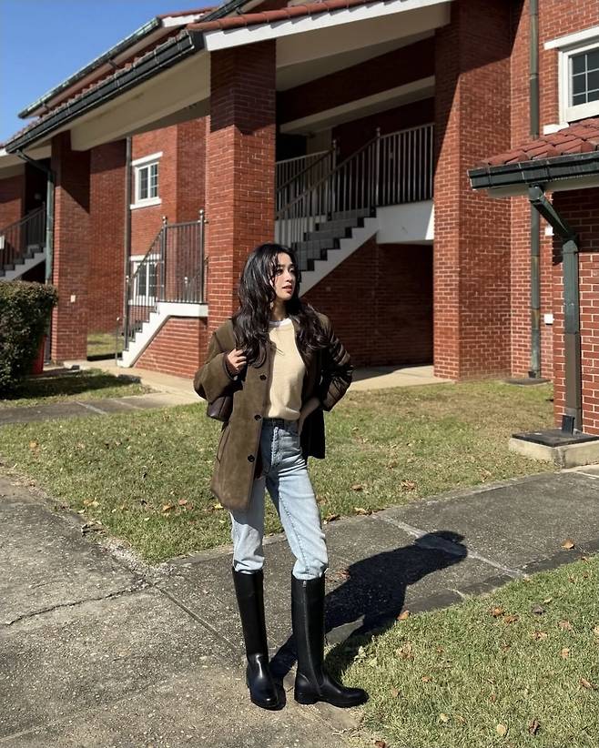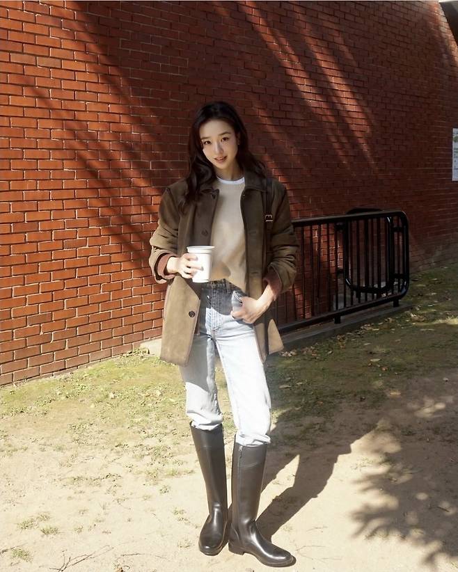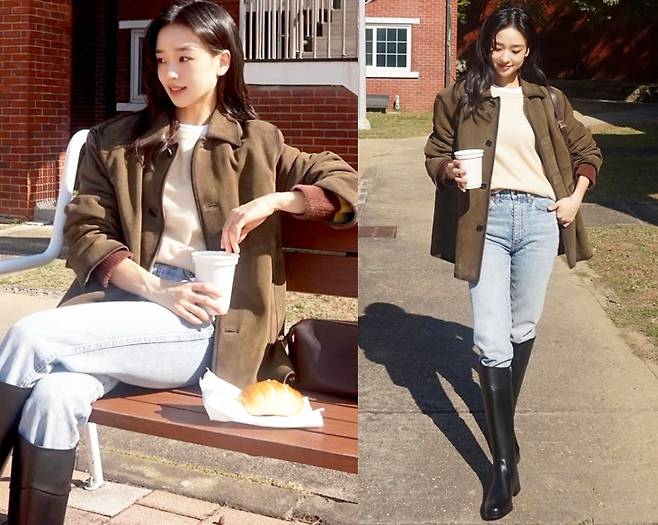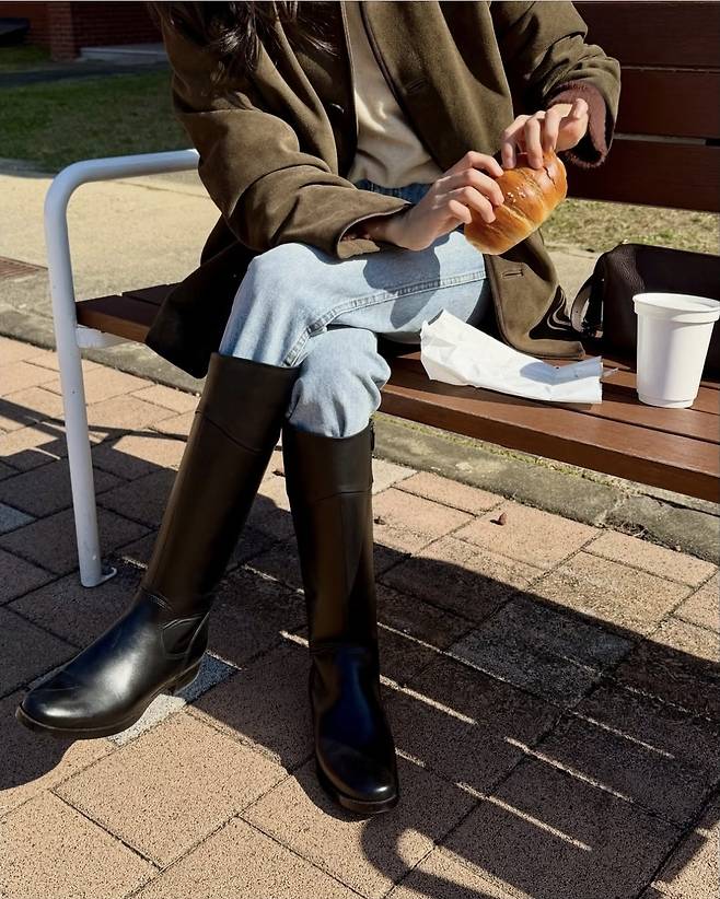 자연스럽게 걷어올린 소매 디테일과 루즈한 핏이 캐주얼한 분위기를 살렸고, 무릎까지 올라오는 블랙 롱부츠로 실용성과 스타일을 동시에 챙겼습니다.