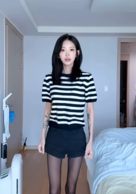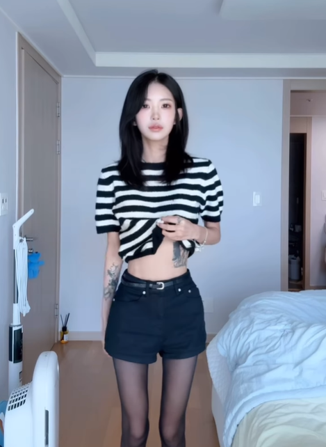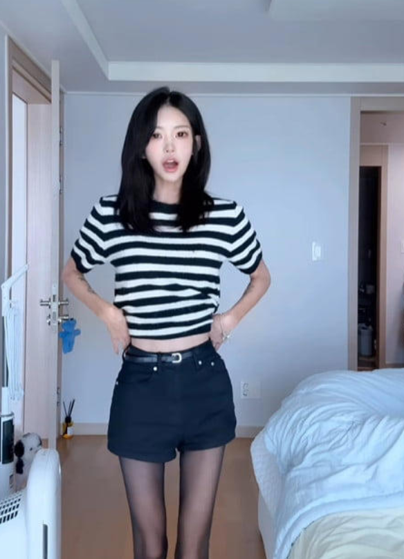 블랙&화이트 스트라이프 니트 탑에 하이웨이스트 핫팬츠, 시스루 스타킹을 매치해 한층 길어 보이는 각선미를 강조한 이번 룩은 단순한 일상복을 넘어서 하나의 패션 선언처럼 느껴졌다.