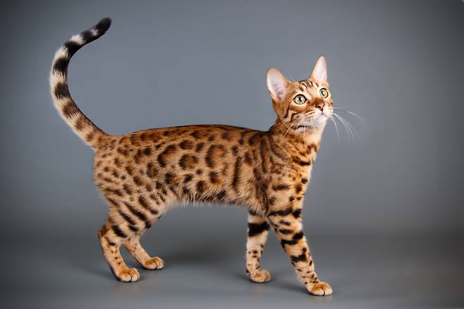뱅갈 고양이는 표범을 떠올리게 하는 아름답고 화려한 무늬가 특징으로, 야생 고양이와 집고양이 사이에서 태어났다고 해요.