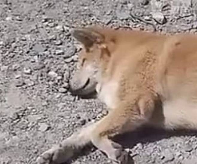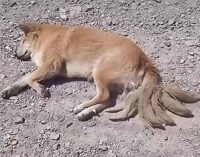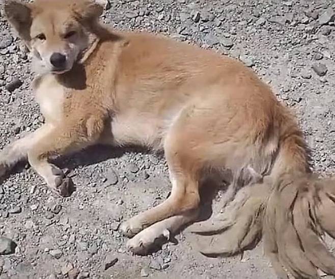 멀리서 봤을 때 마치 꼬리가 8개나 달린 듯 보이는 강아지가 길가에 누워 있었던 것이 아니겠습니까.