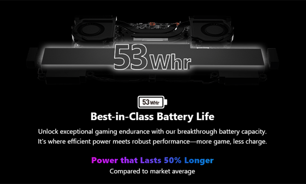 여기에 동급 기기들보다 용량이 더 큰 53Whr 배터리를 탑재하여 전체 작업 부하에서 2시간의 배터리 수명을 제공한다. 전원 어댑터는 경쟁 기기들과 동일한 65W USB-C PD 3.0 고속 충전이 가능하다.