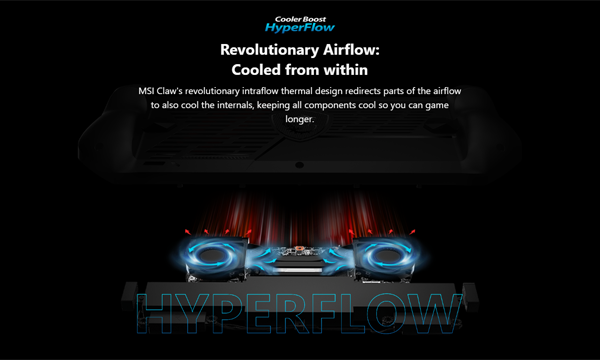 Claw A1M이 휴대용 게임에 맞춰 동작 클럭이나 소비 전력을 제한해도 발열이나 배터리 소모가 커질 수 있는데, MSI는 이에 대비하여 열을 효율적으로 발산하는 듀얼 팬과 히트파이프를 갖춘 MSI 독점 쿨러 부스트 하이퍼플로우(MSI Cooler Boost Hyperflow) 기술이 통합되어 있다고 설명한다.