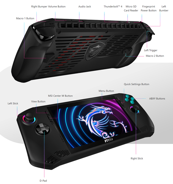 컨트롤러도 ROG Ally와 마찬가지로 A/B/X/Y 버튼과 좌/우 아날로그 스틱, D-패드, 좌/우 아날로그 트리거, 좌/우 범퍼를 기본으로 갖췄으며, 보기(View) 버튼, 메뉴 버튼, MSI Center M 버튼, OSD 키, 그리고 2개의 지정 가능한 그립 버튼을 제공한다. 다른 기기들처험 6축(6-Axis) IMU 및 HD 햅틱 기능도 들어간다. 아날로그 스틱과 A/B/X/Y 버튼에는 RGB LED 조명이 적용되어 있다. 지문인식 전원 버튼으로 보안 기능도 제공하고 있다.